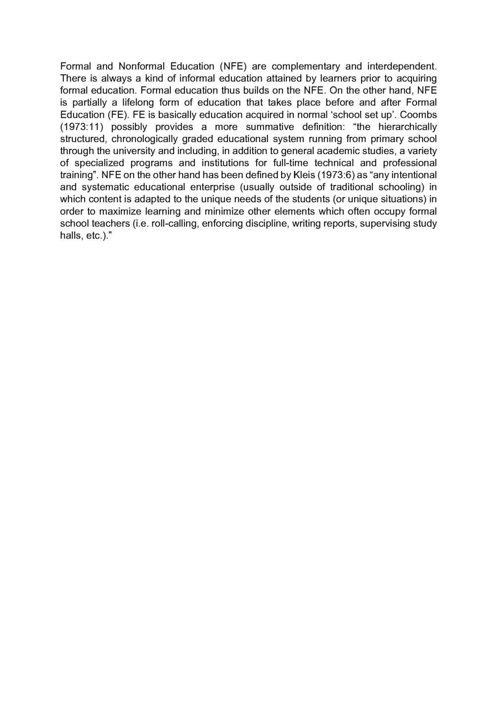 Formal and Nonformal Education (NFE) are complementary and interdependent. There is always a kind of informal education attained by learners prior to acquiring formal education. Formal education thus builds on the NFE. On the other hand, NFE is partially a lifelong form of education that takes place before and after Formal Education (FE). FE is basically education acquired in normal ‘school set up’. Coombs (1973:11) possibly provides a more summative definition: “the hierarchically structured, chronologically graded educational system running from primary school through the university and including, in addition to general academic studies, a variety of specialized programs and institutions for full-time technical and professional training”. NFE on the other hand has been defined by Kleis (1973:6) as “any intentional and systematic educational enterprise (usually outside of traditional schooling) in which content is adapted to the unique needs of the students (or unique situations) in order to maximize learning and minimize other elements which often occupy formal school teachers (i.e. roll-calling, enforcing discipline, writing reports, supervising study halls, etc.).”